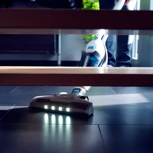 - Quatre LED sur le devant de l’aspirateur rendent la saleté visible même dans les coins sombres et sous les meubles