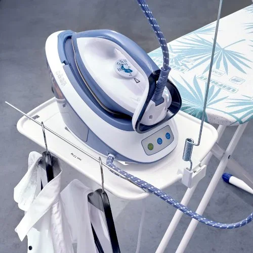 - ne pas poser le fer à repasser sur la housse lors du repassage, mais uniquement sur le repose-fer prévu à cet effet de la centrale vapeur, ou sur le support pour fer en silicone.