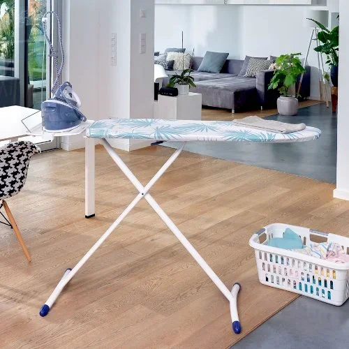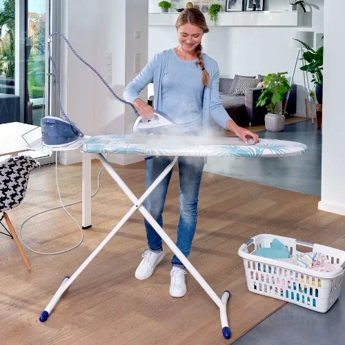 Très légère, stable et parfaite pour l'utilisation d'une centrale vapeur. La table à repasser Air Board Express M Solid Palm Leaf de Leifheit offre tout ce dont une table de repassage moderne a besoin. Elle est plus légère qu'une table à repasser en métal déployé tout en restant stable. Elle est dotée d'une housse de repassage en coton pur et perforé. Celle-ci laisse pénétrer la vapeur du fer à repasser et garantit en même temps une absorption optimale de l'humidité. Afin de faciliter l'installation et le rangement, la table de repassage AirBoard Express M Solid Palm Leaf est équipée d'un plateau de repassage constitué d'un matériau plastique spécial ultraléger. Le plateau de repassage de 120 x 38 cm repose sur un châssis résistant et absolument stable constitué de tubes en acier de 35 mm de diamètre. Elle peut être réglée en hauteur jusqu'à 100 cm et s'adapte ainsi à votre taille et votre hauteur de travail. La table de repassage est équipée d'un support fixe pour centrale vapeur qui s'adapte à toutes les centrales vapeurs classiques et est équipée d'un creux de sécurité pour les fers à repasser traditionnels. Le crochet pour cintres au niveau du repose-fer permet de suspendre chemises ou vestes après le repassage. Avec guide-fil pour ne pas être gêné pendant le repassage. Avec housse au motif palmiers tendance.- Idéal pour les centrales vapeur de par la housse perméable à la vapeur en coton perforé