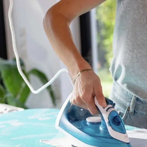 - ne pas poser le fer à repasser sur la housse lors du repassage, mais uniquement sur le repose-fer de la centrale vapeur prévu à cet effet, ou sur le support pour fer en silicone.