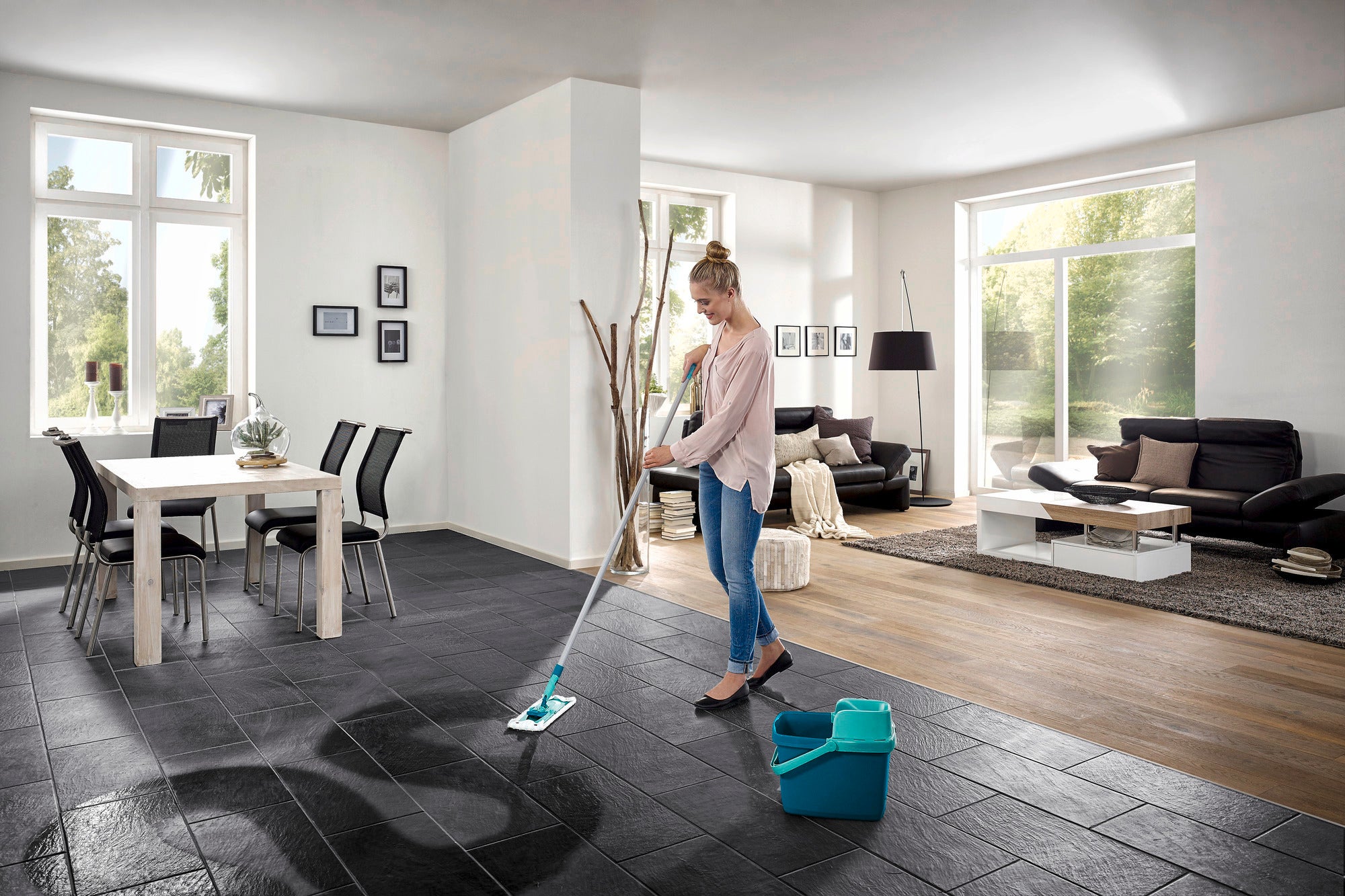 Le panier essoreur de Leifheit permet un essorage sans mettre les mains dans l'eau. En plus, il est facile à manipuler, il suffit de l'appuyer sur le seau jusqu’à ce qu’il s’enclenche !