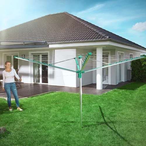 Grâce au confort Easy-Lift, la Linomatic 500 Comfort s’ouvre presque sans effort et se replie tout aussi vite via le déverrouillage sur le mât. Avec 50 m de corde, elle accueille jusqu’à cinq cycles de linge. L’enroulement automatique met les fils à l’abri à l’intérieur des bras, pour des cordes durablement propres et une utilisation pratique au quotidien.