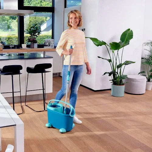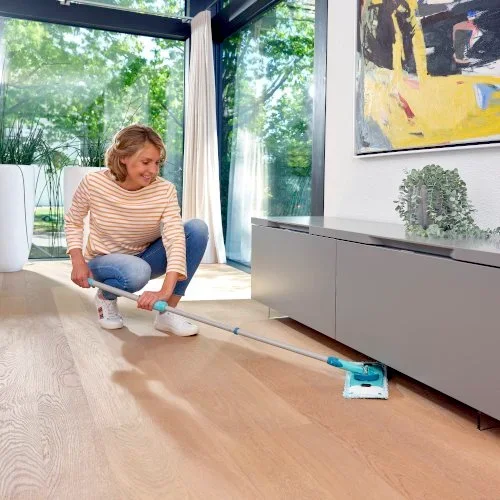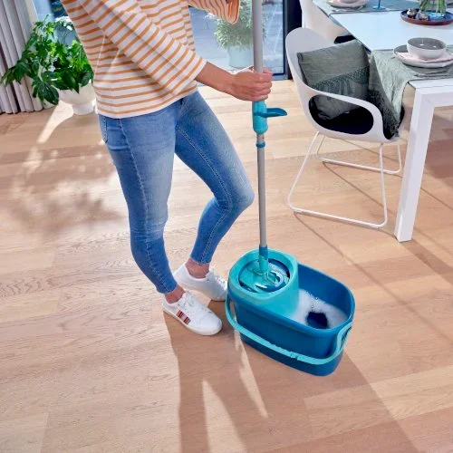 Met de hendel op de steel van de Leifheit wisser kun je het centrifugeren heel eenvoudig stoppen, als de vloerdoek de gewenste vochtigheidsgraad voor je vloer bereikt heeft.