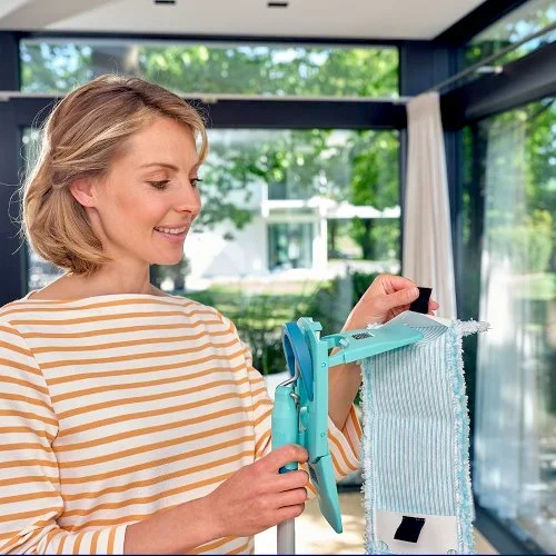 De vloerdoek is heel gemakkelijk aan te brengen en te verwijderen, dankzij de handige insteekranden met klittenband. De vloerdoek blijft ook tijdens het centrifugeren stevig vastzitten aan de Leifheit vloerwisser.