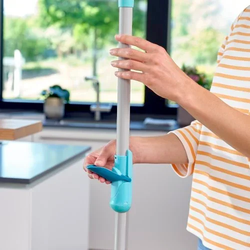 De Leifheit vloerwisser is verstelbaar van 110 tot 140 cm, voor een optimale rugvriendelijke werkhoogte. Met de grote voetknop kun je de wisserplaat heel gemakkelijk ontgrendelen voor het centrifugeren.