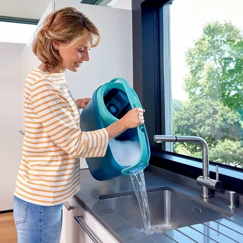 Dankzij de uitsparing in de emmer kun je het vuile water handig zonder knoeien uitgieten na het poetsen met vloerwisserset CLEAN TWIST M Ergo mobile van Leifheit.